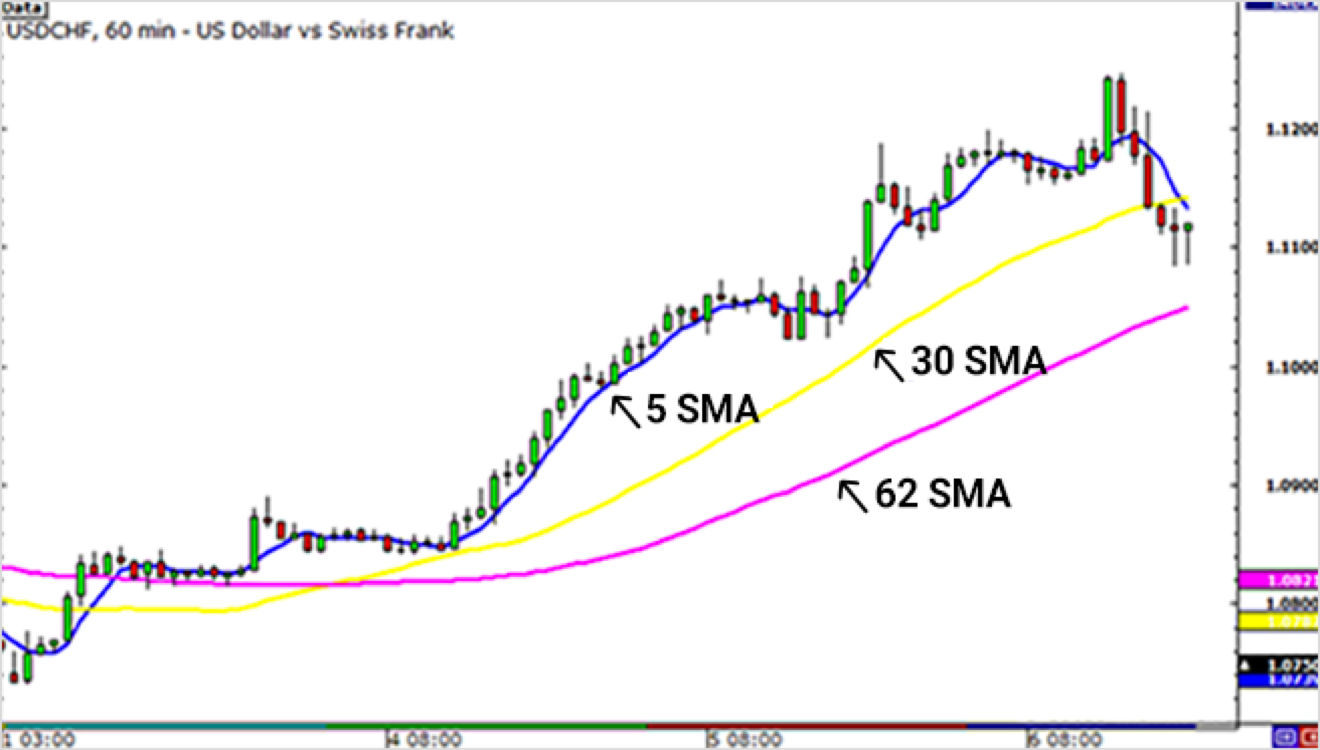 위 차트 (USD / CHF 1 시간 차트)에서 3가지의 다른 SMA를 가리킵니다. 차트에서 보고 알다시피 SMA기간이 길수록 가격와의 사이에 지연이 발생합니다.